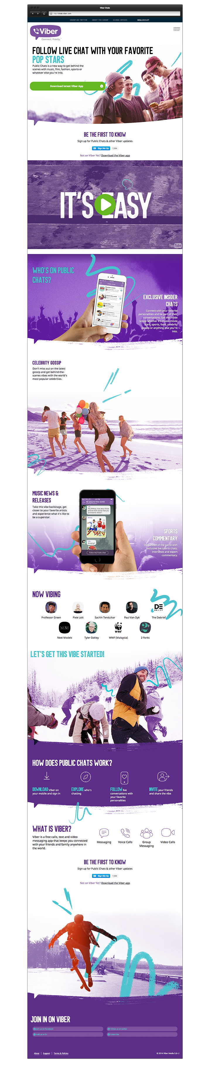 Solution This youthful and optimistic site gave motion and energy to the new Public Chats feature. With stylized photography, bright colors, and expressive lines lead a user’s eye through the content. There is a video element to tell the Viber Public Chats story further, and multiple points to interact with the Viber brand. The icon style I developed has a sketched feel to match the expressive lines. This is all to give a user the sense that they are giving life to the Viber Public Chats, which in many ways they are. It’s not just a service, but a co-created content platform.